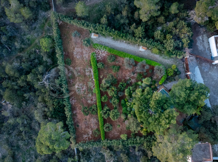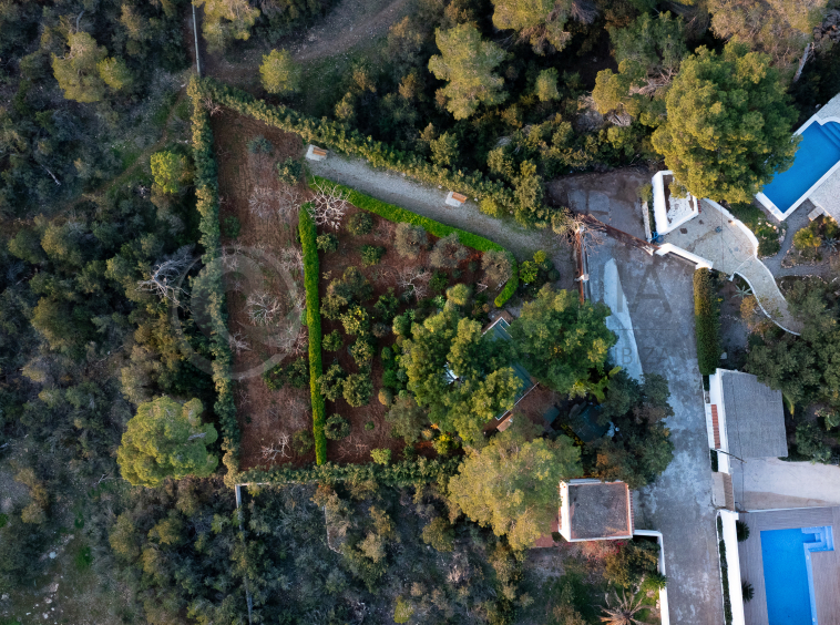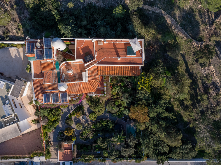 The fully developed and fenced plot covers 928 m² and is accessible via an electric entrance gate. It features convenient driveways to the garage as well as well-maintained natural stone paths and stairways connecting all areas of the property. A low-maintenance garden with automatic irrigation surrounds the house.