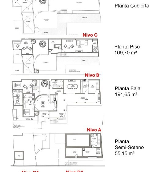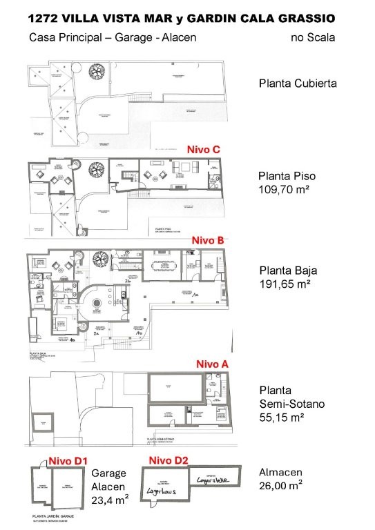 La superficie total construida y útil es de aproximadamente 467 m², distribuidos en varios niveles. En la planta baja de la villa principal hay un estudio independiente con baño y lavadero (aproximadamente 55 m²). El nivel intermedio incluye un amplio salón-comedor con cocina abierta, biblioteca, galería de arte, dos dormitorios, dos baños, un aseo de invitados y una sala de fiestas con bar. Esta planta ofrece unos 192 m² de superficie habitable, además de 61 m² de terrazas cubiertas. En la planta superior se encuentra una entrada representativa con galería, otra sala de estar, un baño con ducha y una oficina, en una superficie de unos 110 m².