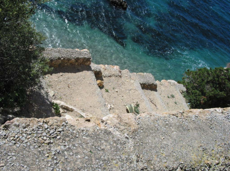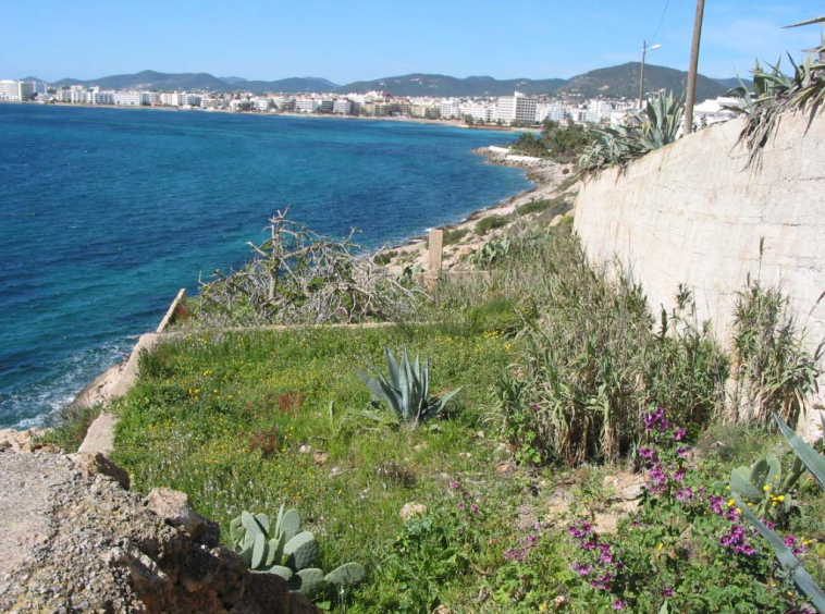 The plot has a total surface area of 852 m², divided into two sections: one of 445 m² located on Calle Ramón Muntaner, and another of 407 m² featuring natural stone walls and terraced levels. These terraces offer stunning sea views, and just below them lies a small sandy beach. The property is enclosed by a simple fence with a gated entrance from Calle Ramón Muntaner.